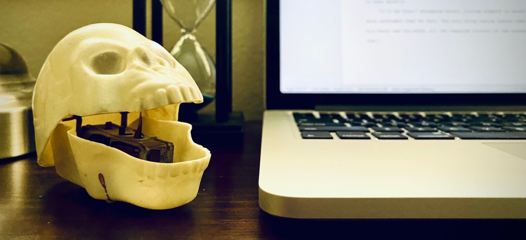 When I got back to the keyboard this morning, I started by cycling back through those first thousand words and trying harder to hear what the story was telling me. Just a few paragraphs in, I found that missing party: Jaw, a talking skull in the corner of the room.